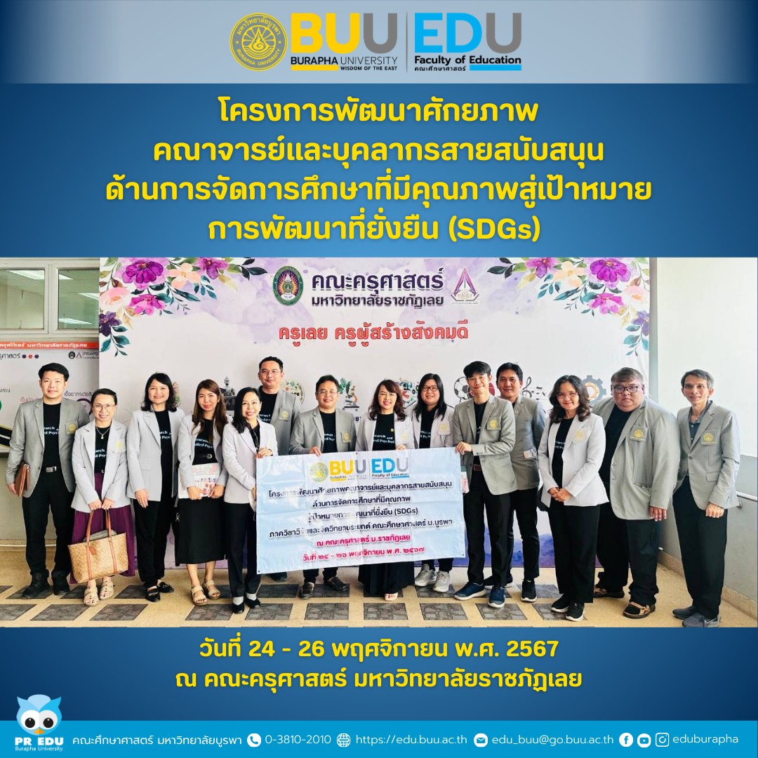 วันที่ 24 - 26 พฤศจิกายน พ.ศ. 2567 ภาควิชาวิจัยและจิตวิทยาประยุกต์ คณะศึกษาศาสตร์ จัดโครงการพัฒนาศักยภาพคณาจารย์และบุคลากรสายสนับสนุนด้านการจัดการศึกษาที่มีคุณภาพสู่เป้าหมายการพัฒนาที่ยั่งยืน (SDGs) ณ คณะครุศาสตร์ มหาวิทยาลัยราชภัฏเลย จังหวัดเลย เพื่อสร้างความรู้ ความเข้าใจ และประสบการณ์เกี่ยวกับการศึกษาที่มีคุณภาพสู่เป้าหมายการพัฒนาที่ยั่งยืน (SDGs) และสร้างเครือข่ายความร่วมมือทางวิชาการ การวิจัย การประกันคุณภาพการศึกษาร่วมกับสถาบันอุดมศึกษา ตลอดจนเพื่อศึกษา แลกเปลี่ยนเรียนรู้วิถีชีวิตเชิงพหุวัฒนธรรม ชาติพันธุ์ไทดำ สถาปัตยกรรมและอารยธรรมริมฝั่งโขง ที่สะท้อนถึงการพัฒนาที่ยั่งยืนของพื้นที่ริมฝั่งโขงแถบบริเวณจังหวัดเลย