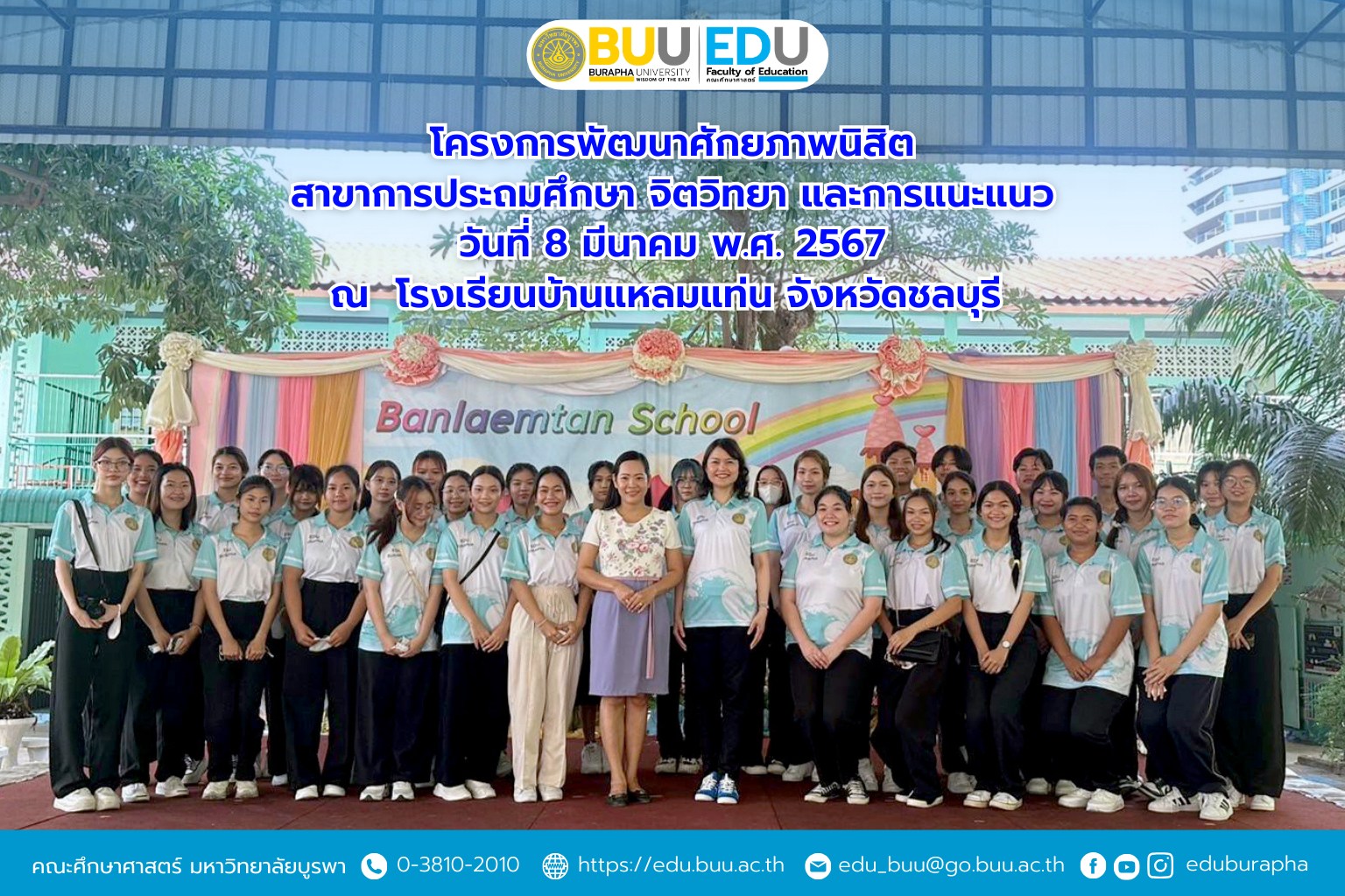 ณ โรงเรียนบ้านแหลมแท่น โดยมีวัตถุประสงค์ส่งเสริมให้นิสิตสาขาวิชาการประถมศึกษา จิตวิทยา และการแนะแนว
