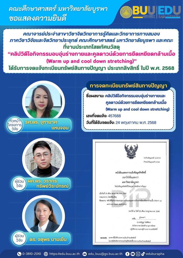 งานประเภทโสตทัศนวัสดุ “คลิปวิดีโอกิจกรรมอบอุ่นร่างกายและคูลดาวน์ด้วยการยืดเหยียดกล้ามเนื้อ(Warmup and cool down stretching)” ได้รับการจดแจ้งทะเบียนทรัพย์สินทางปัญญาประเภทลิขสิทธิ์ ในปี พ.ศ. 2568