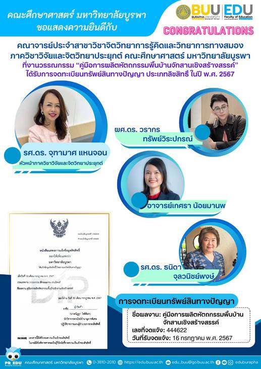 ขอแสดงความยินดีกับ คณาจารย์ประจำสาขาวิชาจิตวิทยาการรู้คิดและวิทยาการทางสมอง ภาควิชาวิจัยและจิตวิทยาประยุกต์ คณะศึกษาศาสตร์ มหาวิทยาลัยบูรพา